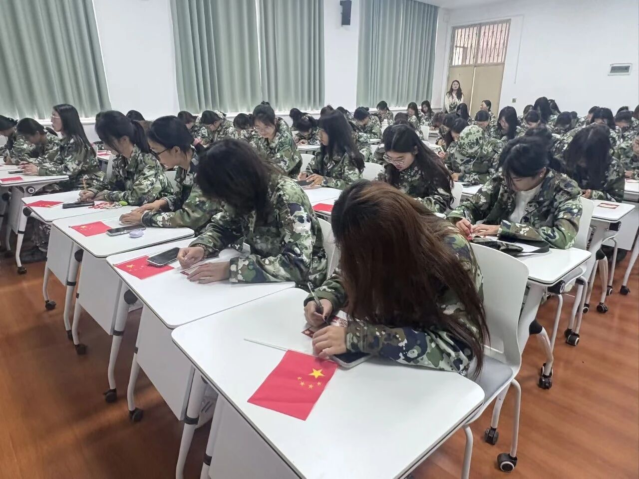 相信现在每个人心中都有许多话想表达,或许是对祖国的祝福,或是对青春的希冀,又或许是对校园生活的期待。现在,我们进入“心语传递”环节,大家拿起桌上的卡片和笔,把心里的话写下来。不用在意字数多少,每一句真诚的话语,都是我们与家国、与彼此的情感联结。