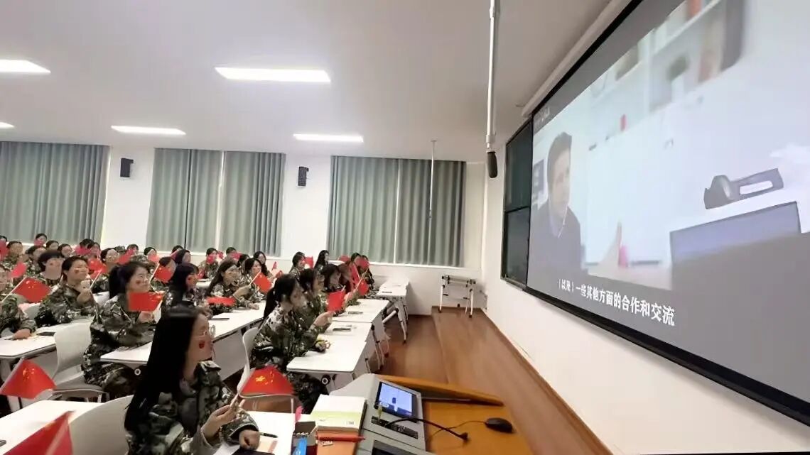 播放纪录片《奋进中国》,同学们手持小国旗观看,直观感受祖国伟大成就,现场氛围庄严且充满自豪感。