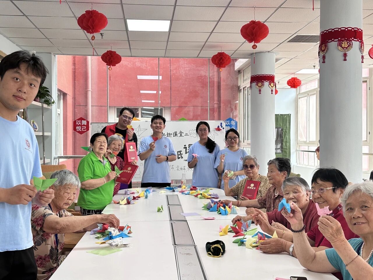在守护红色记忆、赓续精神血脉实践的同时,团队又在公寓社工部指导下,精心打造多元课程活动,丰富老年人生活。健康课融合健身操与健康知识,帮助老人强身健体、树立健康理念;兴趣班开设声乐、折纸、钩针等课程,让老人重拾创作乐趣;体育活动组织跳棋、乒乓球等竞技,老人们专注投入、活力四射,尽显“老有所乐”。成员田帅、朱泓光表示,老人们在活动中展现的生命力深深感染了大家。