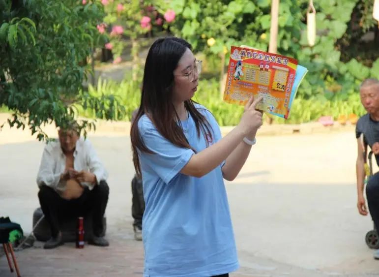 为了让老人们拥有更健康的体魄,队员沙千贺化身“健康使者”,带领老人们学做头肩操。他耐心示范,老人们跟着他的动作舒展筋骨,脸上洋溢着笑容。这种互动不仅唤醒了老人们的身体活力,也让“体医融合”的健康理念在实践中落地生根。队员张艺馨结合《老年健康手册》,用通俗易懂的语言为老人们讲解常见病的预防与护理知识。她将复杂的医学理论转化为实用的健康指南,帮助老人们更好地管理慢性病,提升生活质量。