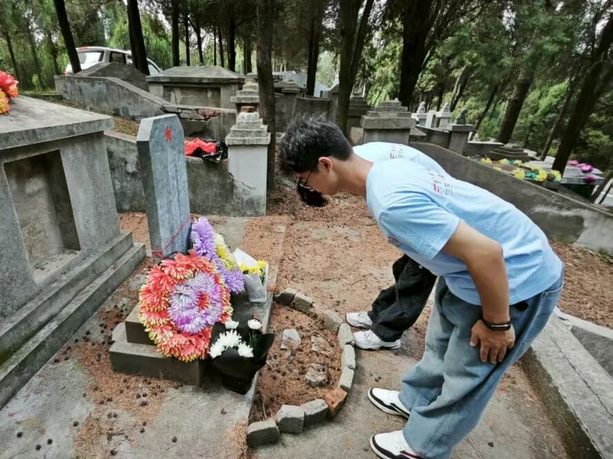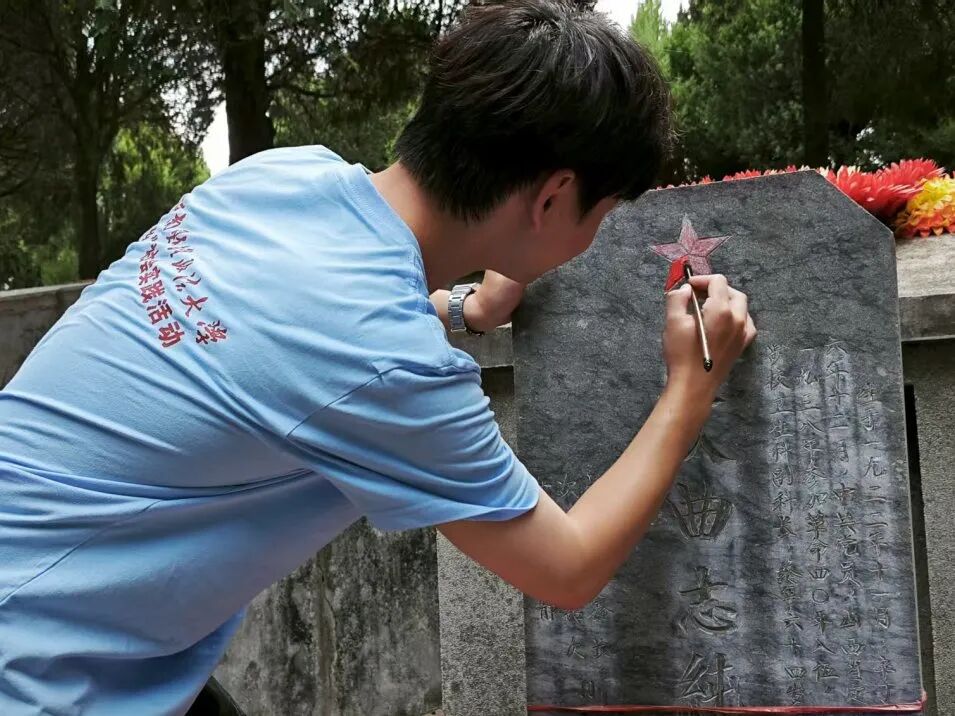 实践伊始,团队专赴河南省信阳市烈士陵园缅怀先烈。队员们在肃穆的氛围中向烈士纪念碑敬献花篮,整理缎带、鞠躬致敬。队员们后又手持毛笔蘸取朱砂,将碑上烈士姓名描红。这一庄严仪式既“重现”烈士英名,更传递着青年学子对革命先辈的赤诚敬意与无限追思。